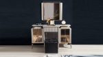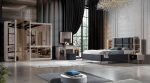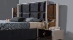 The centerpiece is the bed, featuring a striking headboard with a geometric, paneled design in a deep, rich hue, accented by sleek metallic details that add a touch of glamour. The integrated under-bed storage provides an excellent solution for keeping your bedroom tidy and organized. Flanking the bed are two distinctive side tables, each showcasing a modern design with mirrored accents and ample surface space for your bedside essentials. The set also includes a complementary dresser and a matching mirror, designed to harmonize with the overall aesthetic and offer substantial storage and a cohesive look for your dressing area. This Armi bedroom set is a perfect choice for those seeking a luxurious and highly functional bedroom ensemble.