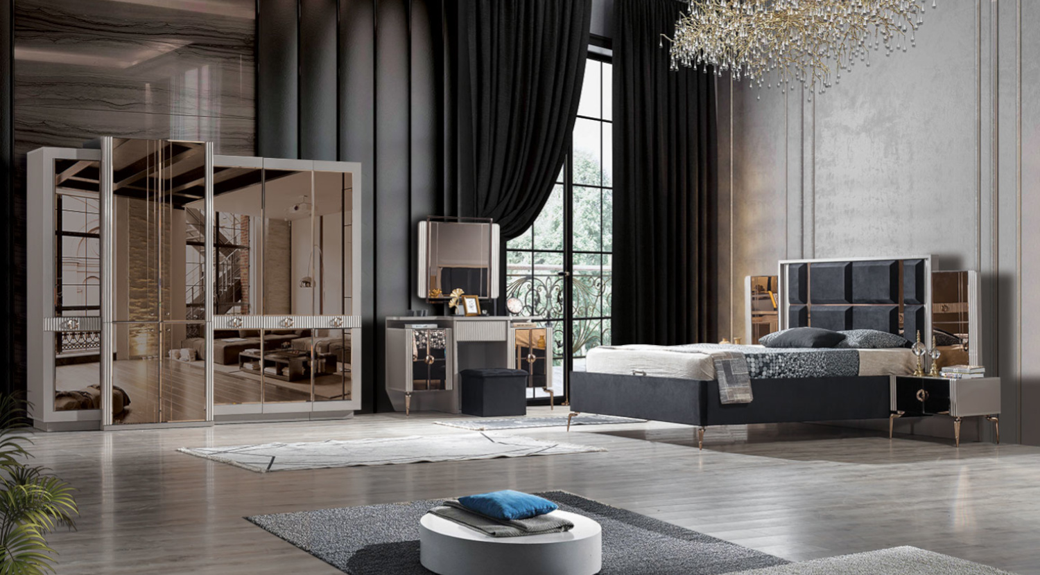 This sophisticated Armi bedroom set, offers a blend of contemporary design and practical luxury, ideal for a refined sleeping space. The complete set includes a stylish bed frame with convenient under-bed storage, a comfortable mattress, two chic side tables, a functional dresser, and an elegant mirror.