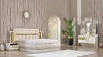 The centerpiece is the bed, featuring a grand, upholstered headboard with plush, horizontally tufted panels and striking gold-finished accents on either side, adding a touch of opulence. The integrated under-bed storage provides an excellent solution for keeping your bedroom tidy and organized. Flanking the bed are two chic side tables, each boasting a clean design with gold-toned details and convenient drawers for bedside essentials. The accompanying dresser is a statement piece, offering ample storage with its multiple drawers and showcasing ornate gold-finished hardware. The set is completed by a graceful mirror, designed to complement the dresser’s luxurious feel and enhance the room’s sense of space and light. This Berlin bedroom set is an ideal choice for those seeking a blend of high-end design, comfort, and practical storage solutions.
