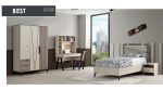 The bed features a contemporary design with a clean-lined frame and a subtly textured headboard, providing a stylish yet comfortable place to rest. The included mattress ensures a good night’s sleep. Beside the bed, a single side table offers practical storage with its drawer and open shelf, perfect for a bedside lamp, books, or personal items. While the image also shows a spacious wardrobe and a well-appointed study desk unit, this particular “Best” set focuses on the core sleep area. Its neutral color palette and sleek design make it versatile enough to complement various room decors and adapt as your child grows. This set is an excellent choice for optimizing space and providing essential comfort for a child’s bedroom.