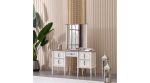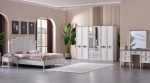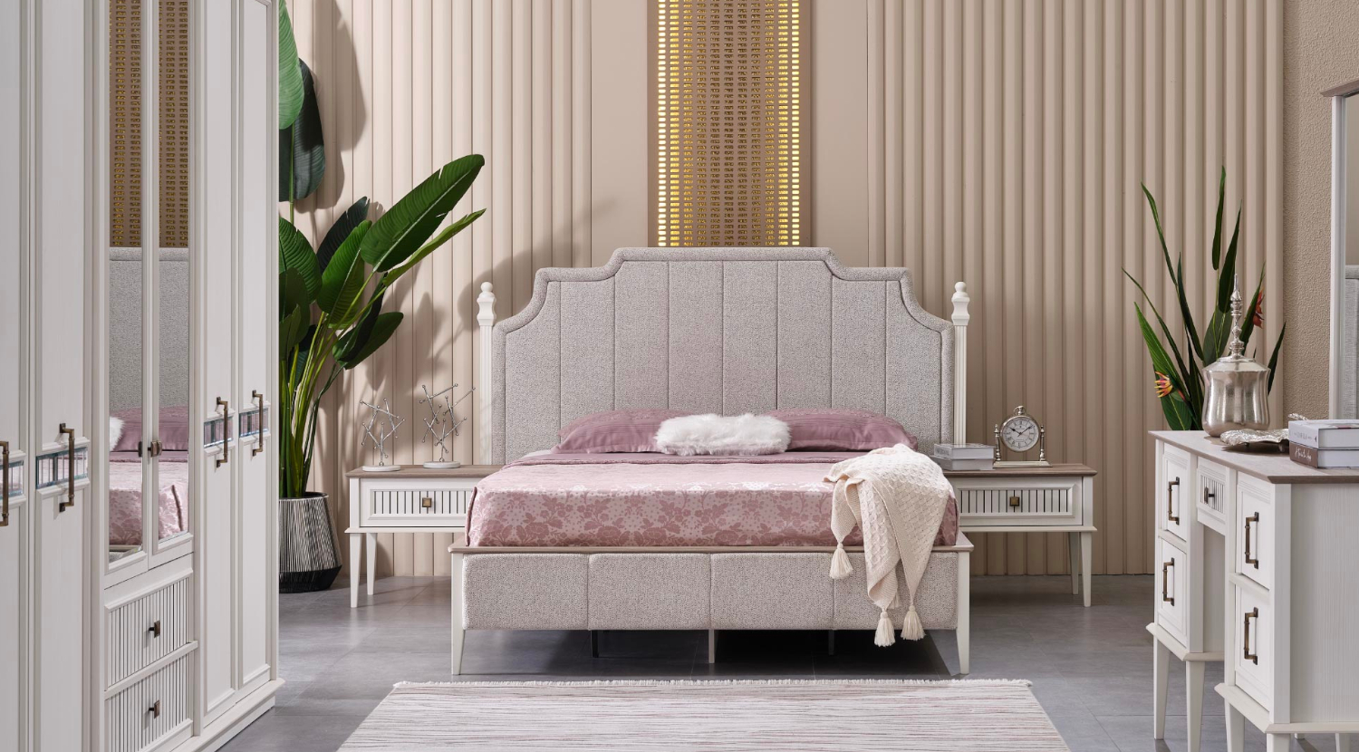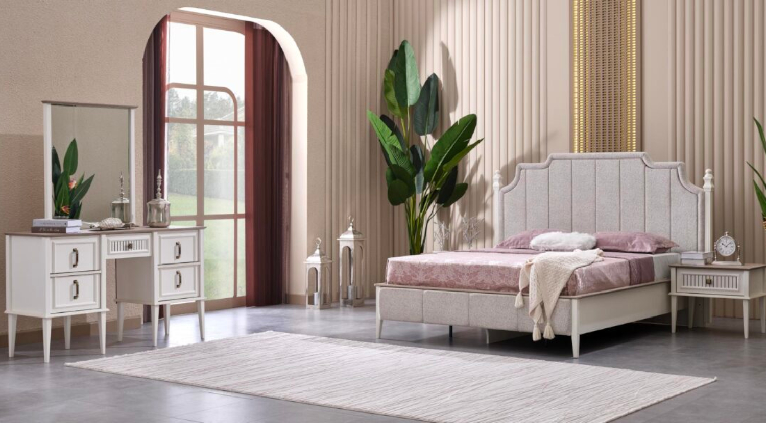The “Madrid” bedroom set offers a sophisticated and elegant design, blending classic charm with contemporary sensibilities. The centerpiece is the bed, featuring a stately, high headboard upholstered in a light, possibly beige or off-white, fabric with subtle vertical channeling and a gently curved, almost scalloped top edge. The headboard’s frame is a lighter wood tone, with decorative finials, giving it a refined, traditional appeal. The bed frame itself is upholstered to match, creating a cohesive look. It includes a mattress, dressed in a muted pink or lavender bedding with a textured throw. Flanking the bed are two side tables (nightstands) that share the set’s elegant aesthetic. These are finished in a light, creamy white with delicate legs and feature a single drawer with a classic bail-pull handle, providing convenient bedside storage. Completing the set is a grand dresser with an integrated mirror. The dresser is a substantial piece, finished in the same creamy white, and features multiple drawers with the matching classic bail-pull handles. Its top surface has a contrasting dark wood finish, adding a touch of richness. The accompanying mirror, framed in a light wood tone with a decorative top, is perfectly sized for the dresser, creating a functional and beautiful vanity area. The entire “Madrid” set evokes a serene and luxurious atmosphere, perfect for a gracefully appointed bedroom.