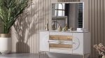 Completing the set is a stylish dresser with a large, integrated mirror. The dresser’s design mirrors the nightstands, featuring a light finish with striking gold-toned accents on its drawers arranged in a radial or fan pattern. The mirror is a large, rectangular piece with a minimalist gold-toned frame that sits atop the dresser, enhancing the set’s luxurious and cohesive feel. The entire collection combines light tones and bold metallics to create an atmosphere of modern elegance.