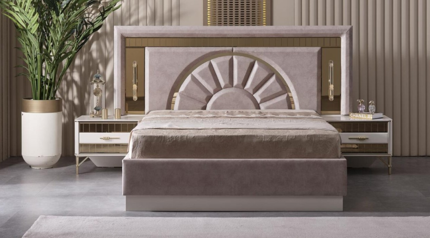 The Taskent bedroom set exudes a glamorous and sophisticated aesthetic, blending modern forms with a strong Art Deco influence. The centerpiece is the bed, featuring a dramatic headboard with a plush, upholstered central panel that has a unique fan-like or ribbed pattern radiating from a central point. This is framed by bold, polished gold-toned geometric accents and a mattress . The bed frame itself is upholstered in a light, neutral fabric, with a storage underneath .