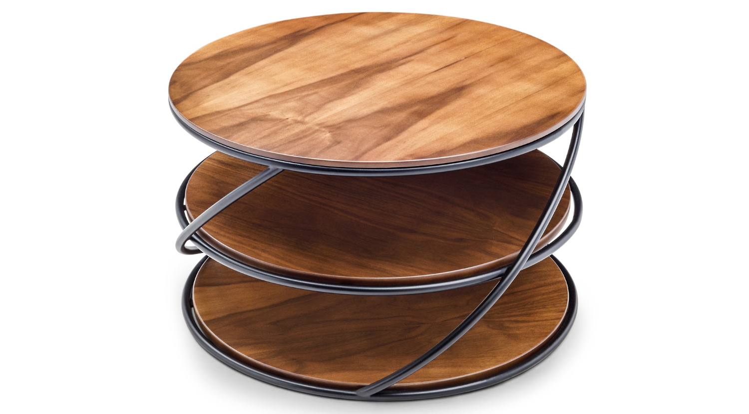 The Circle Center Table offers a unique and contemporary design, perfect for adding functional style to your living area. This table features a distinctive tiered structure composed of three circular surfaces, each crafted from a warm, rich wood with visible grain patterns. These wooden shelves are elegantly supported by a minimalist black metal frame that gracefully curves around the circumference, creating an open and sculptural silhouette. The design allows for multi-level display and storage, making it both a visually striking piece and a practical addition to any modern or industrial-inspired interior.