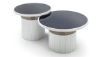 The Diamond Center Table is a contemporary and striking set of two nesting or modular tables, designed to bring a sophisticated flair to any living space. Each table features a sleek, dark circular top, possibly in tempered glass or a dark lacquered finish, accented by a crisp white outer rim. The bases are a true design highlight, combining ribbed or fluted white vertical panels with a contrasting, geometric-faceted mid-section in a warm, taupe or bronze tone. This multi-textured and multi-faceted base design gives the tables a distinct architectural quality. The two tables are of varying heights, allowing them to be nested together for a compact footprint or separated to provide expanded surface area, making the Diamond Center Table a versatile and visually engaging addition to a modern interior.
