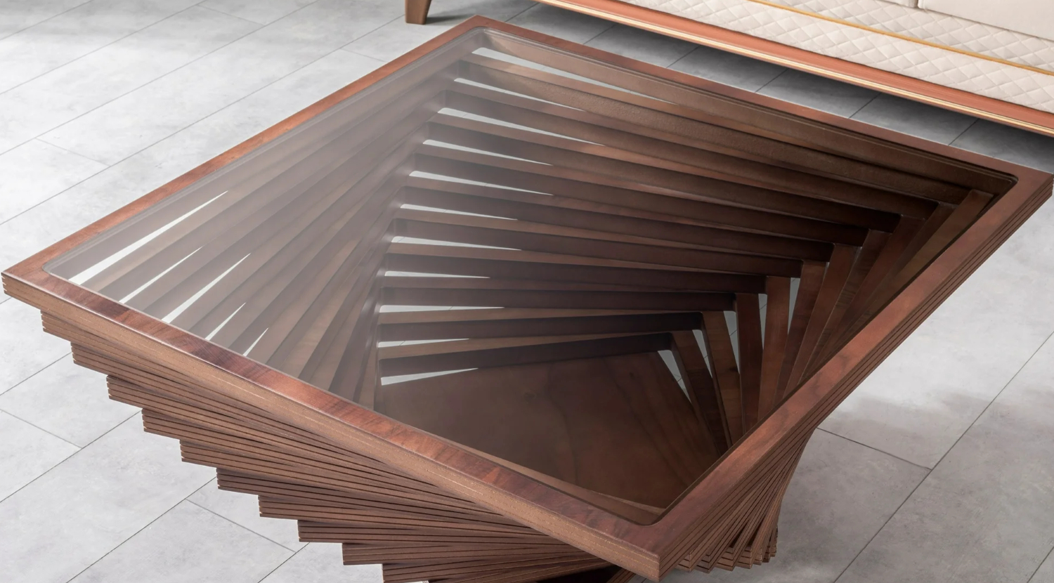 The Frezya Center Table is a striking and modern piece, designed to capture attention with its unique architectural form. This rectangular coffee table features a clear glass top that elegantly showcases its mesmerizing base. The base is expertly crafted from numerous horizontal wooden slats, meticulously stacked and rotated to create a captivating, spiraling, and twisted structure. This dynamic design provides a sense of movement and depth, making the table appear as if it’s gracefully twisting upwards. The rich, warm tones of the wood beautifully contrast with the sleek transparency of the glass top. The Frezya Center Table is not only a functional surface but also a compelling work of art, perfect for adding a sophisticated and contemporary statement to your living area.