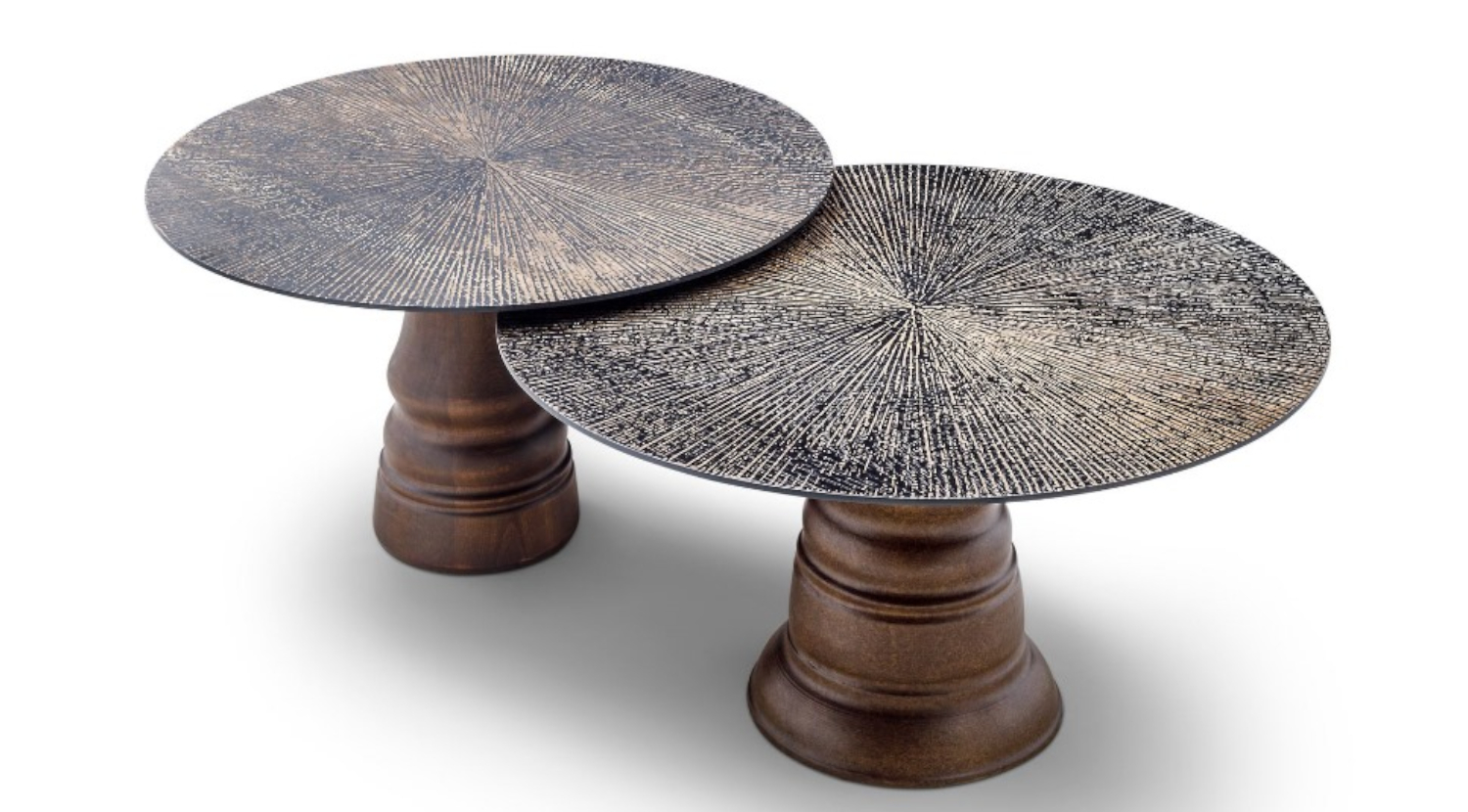 The Galaxy Center Table is a captivating set of two nesting or modular tables, each boasting a unique and artistic aesthetic. Both tables feature circular tops with a distressed, textured finish that resembles a radiating, starburst, or celestial pattern, in tones of dark bronze and lighter metallic accents. This distinctive surface creates a rich visual depth. The tabletops are supported by robust, sculpted wooden pedestal bases with a warm, natural finish, adding an organic and grounding element to the design. The varying heights of the two tables allow for versatile arrangements, whether nested for a compact look or separated to extend surface area. The Galaxy Center Table set offers a blend of artistic flair and natural warmth, making it a unique statement piece for modern or eclectic interiors.