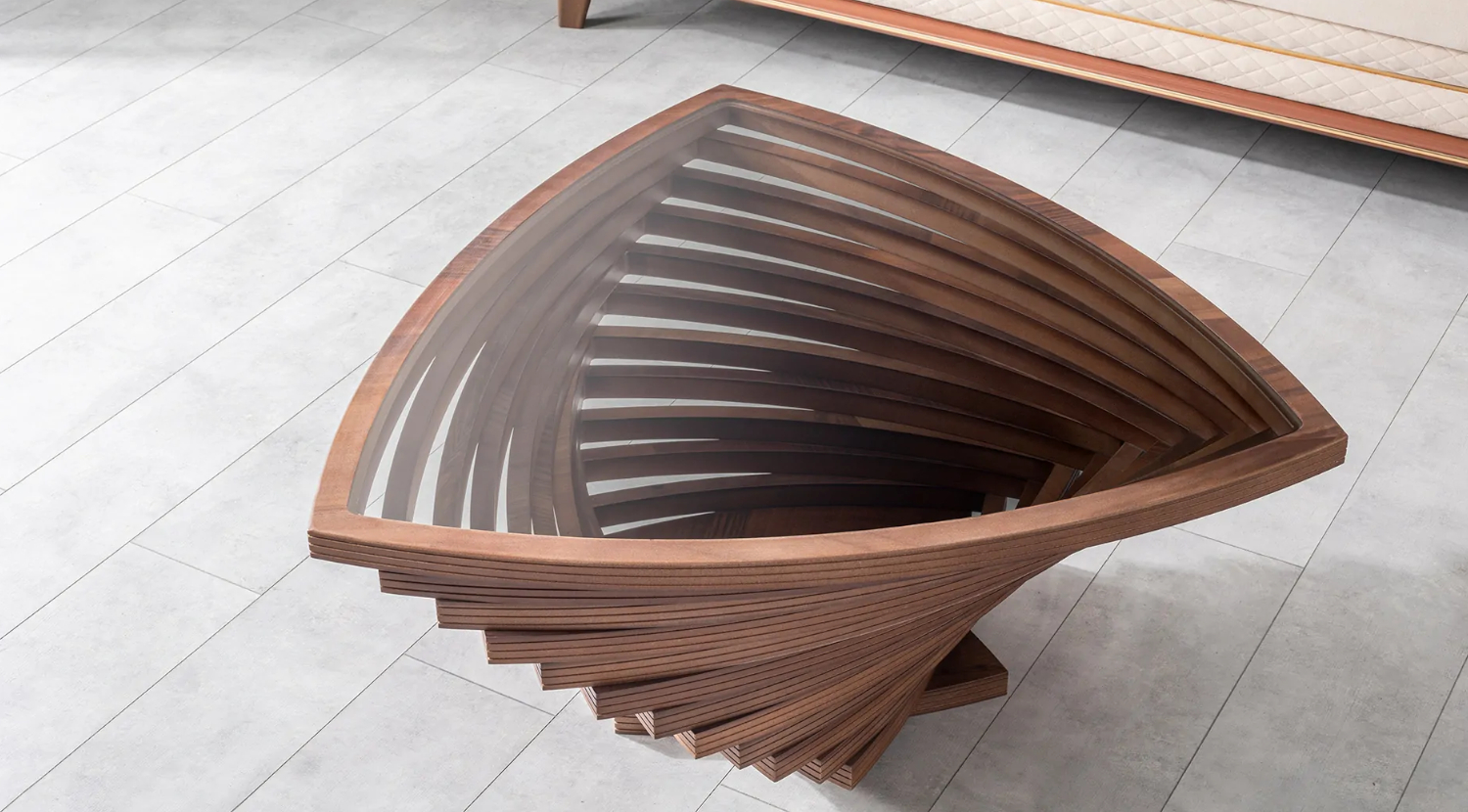 The Krokodil Center Table is an exceptionally unique and sculptural piece, designed to be a striking focal point in a modern or artistic interior. This table features a captivating triangular shape, constructed from warm-toned wooden slats that create a dynamic, spiraling effect. The slats are arranged to form an open, twisted structure, allowing light to filter through and creating intriguing shadows. The top edge defines a clear triangular surface, while the base similarly forms a stable triangular footprint. Its bold, architectural form and natural wood finish make the Krokodil Center Table not just a functional item, but a piece of art that adds movement and interest to any room.
