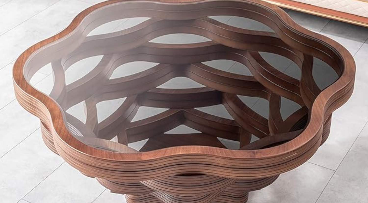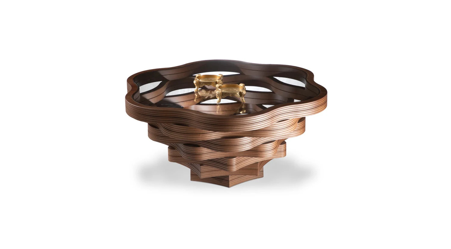 The Papatya Center Table is a truly unique and artistic piece that will serve as a captivating focal point in any living area. This table features an distinctively shaped glass top, a clear nod to its name which means “daisy” or “chamomile” in Turkish, with soft, undulating curves that mimic a blossoming flower. Beneath the glass, the base is a marvel of craftsmanship, constructed from numerous layers of rich, warm-toned wooden slats. These layers are meticulously stacked and shaped to create a flowing, sculptural form that echoes the organic shape of the tabletop. The design allows for an intriguing play of light and shadow through its layered structure, making the Papatya Center Table not just a functional item, but a piece of art that brings natural beauty and modern elegance to your home.
