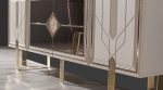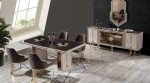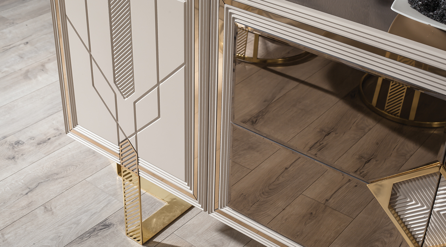 - The Striking Aras Console (Buffet/Sideboard): Complete your dining space with the magnificent Aras Console. This functional and decorative piece features a refined design with a dark top surface, elegant lighter-toned cabinetry, and captivating mirrored or reflective front panels with unique geometric gold-toned detailing. It offers ample storage for your dining essentials and provides a perfect surface for displaying decorative items, serving dishes, or a bar setup.