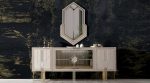 - Complementary Wall Mirror: Adorning the wall above the console is a distinctive mirror, echoing the geometric and luxurious gold-toned design elements found throughout the set. Its unique shape adds an extra layer of style and reflects light to make your space feel larger and brighter.