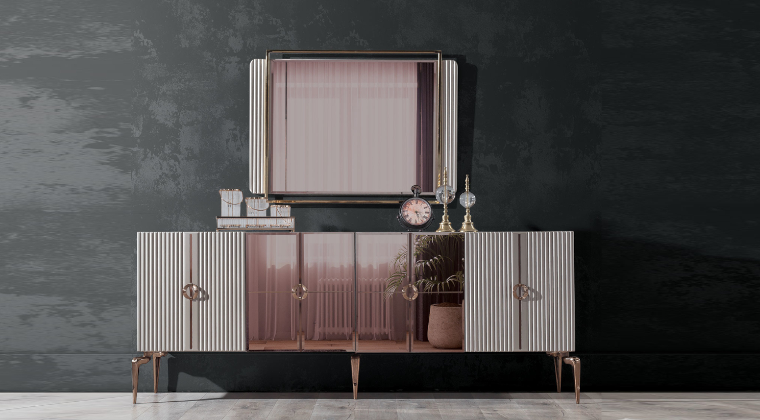 • The Elegant Armi Console (Buffet/Sideboard): Complete your dining room with the highly functional and visually captivating Armi Console. This piece features a sophisticated design with a light-toned top and a body adorned with textured or fluted detailing on some panels, contrasted with beautiful reflective doors framed in the same metallic tone found throughout the set. It offers generous storage space for dinnerware, linens, and serving essentials, while its surface provides an ideal display area for decor.
