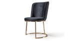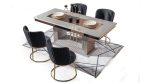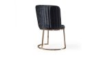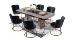 • Six Plush Dining Chairs: Experience unparalleled comfort and style with six exquisitely designed dining chairs. Each chair is upholstered in a rich, dark fabric (velvet material), providing a luxurious feel. The chairs are supported by distinctive, sculptural gold or rose gold-toned metal bases that perfectly echo the metallic accents of the table, creating a cohesive and visually striking ensemble.