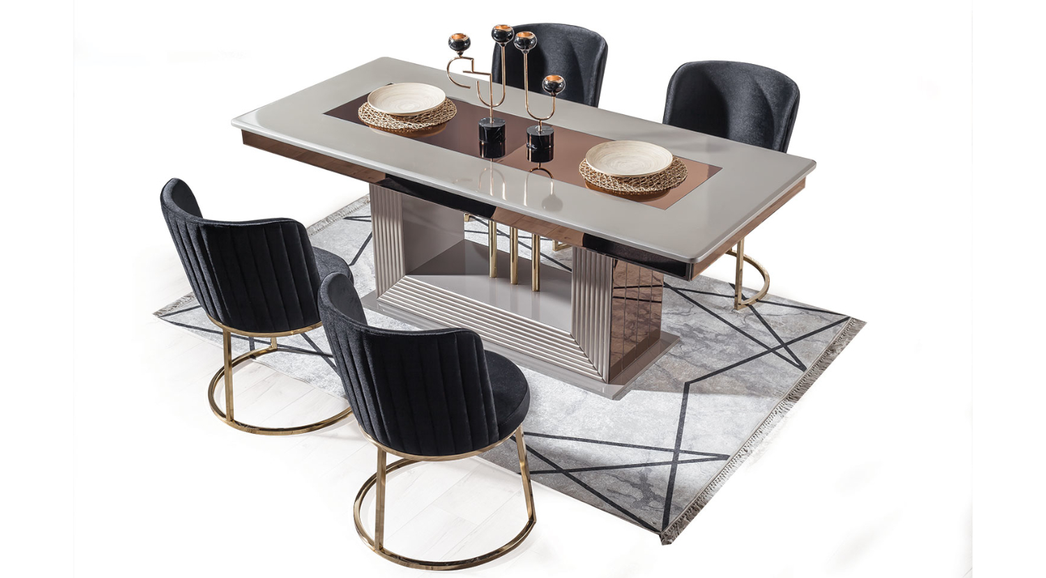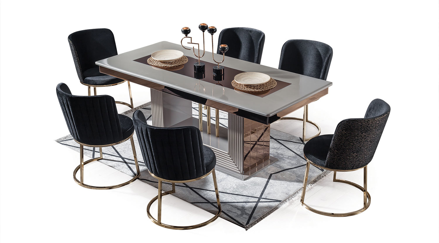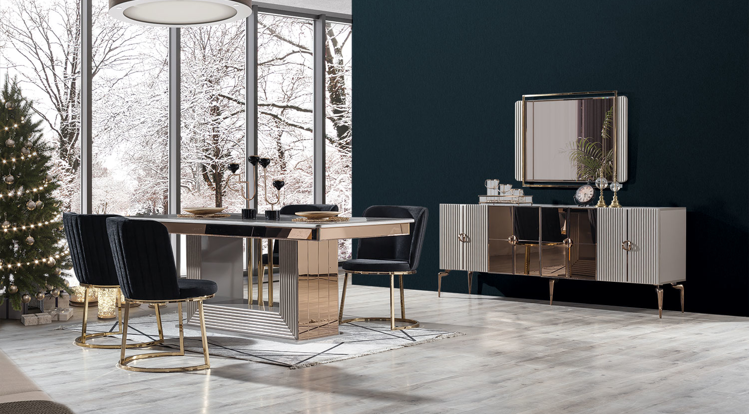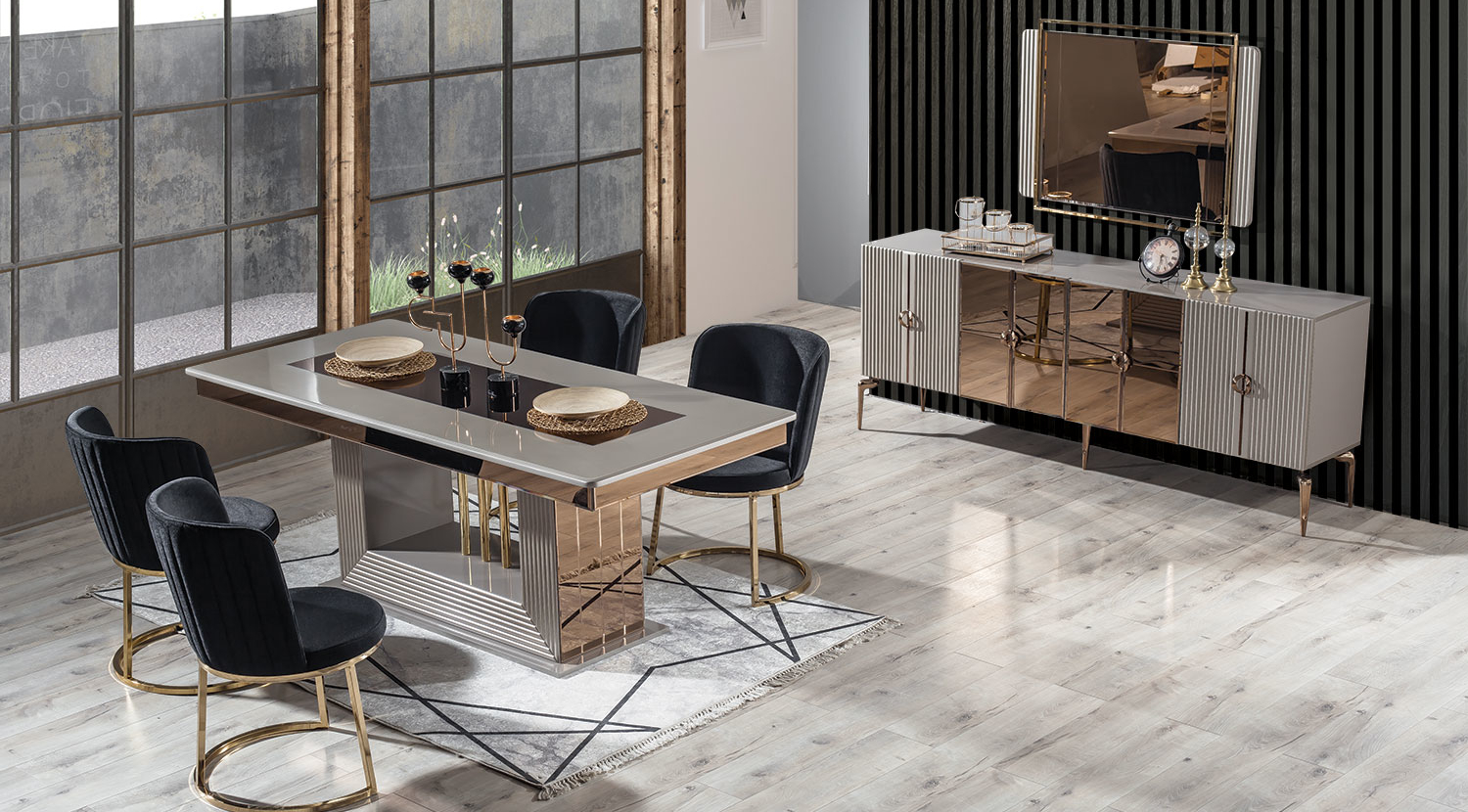 The Armi Dining Room Set is defined by its harmonious blend of light and dark tones, the opulent use of gold/rose gold metallic accents, and refined textural details. It’s the ideal choice for those who desire a dining space that embodies modern luxury and impeccable taste.