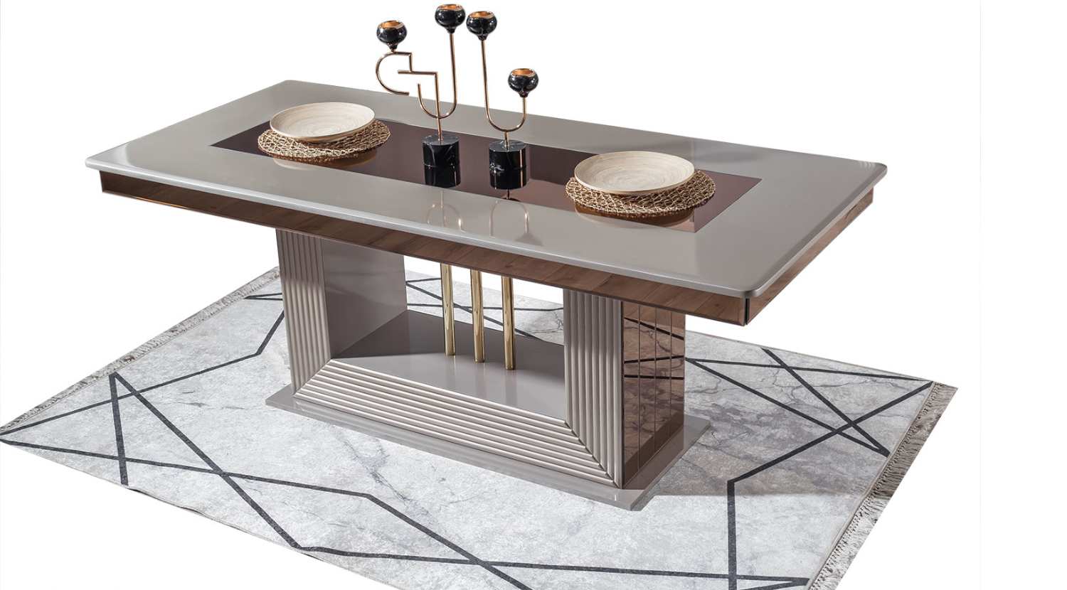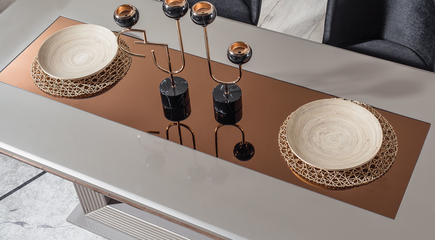 • The Armi Dining Table: A true statement piece, the dining table features a chic, light-toned top (light-colored glass) with striking gold or rose gold trim that outlines its elegant form. The robust base is a work of art in itself, showcasing a harmonious blend of mirrored/reflective panels and subtly fluted surfaces, all accented with complementary metallic tones, giving it a unique and sophisticated presence.