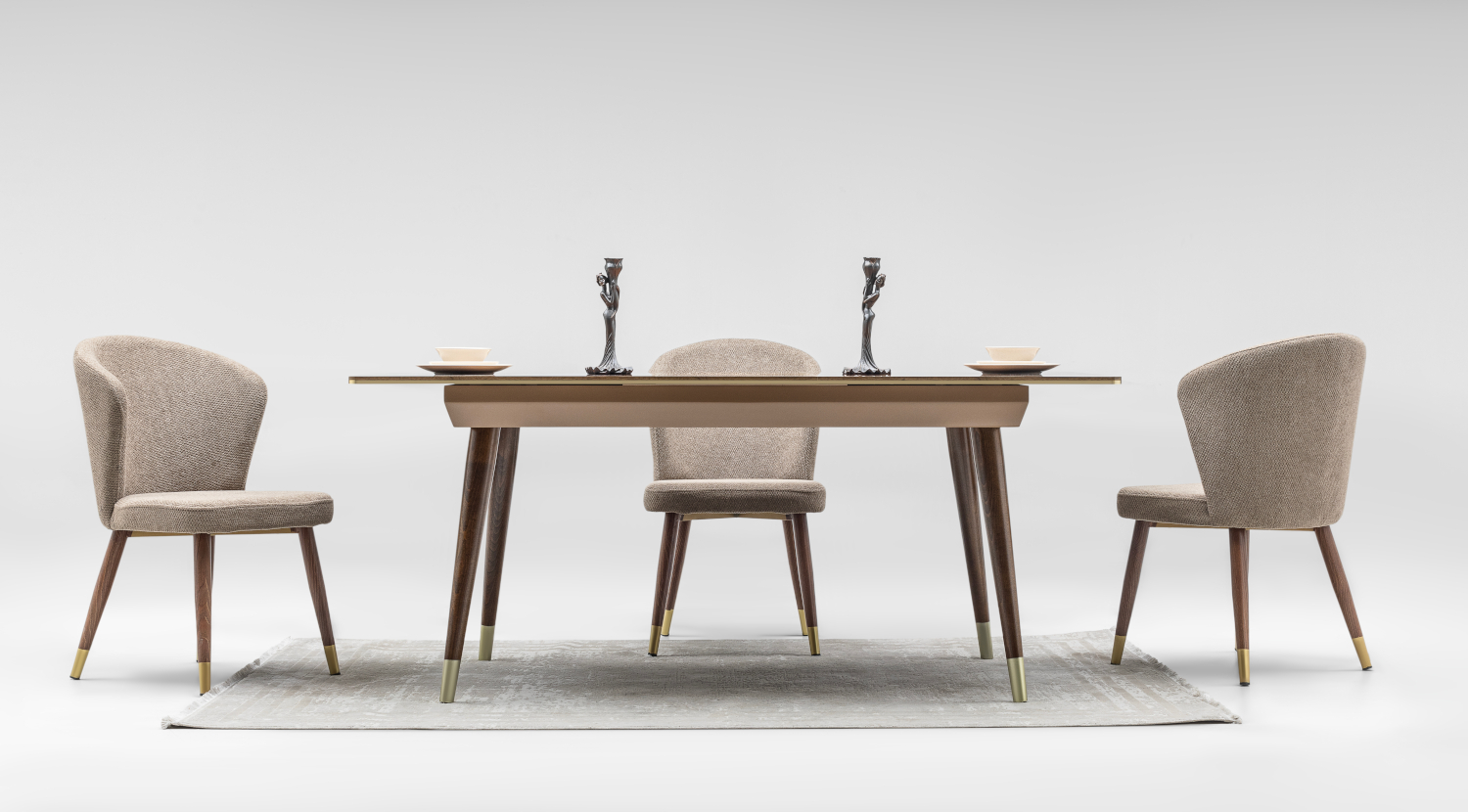 • The Belissa Extendable Dining Table: At the heart of this set is a beautifully crafted table with a rich, warm wood-grain top, likely a high-quality veneer, exuding natural charm. Its standout feature is its extendable design, allowing you to easily expand the tabletop to accommodate more diners when needed, making it perfect for both intimate settings and larger gatherings. The tabletop is elegantly framed by a subtle, refined metallic trim ( brass-toned), adding a touch of understated sophistication. It stands on four slender, tapered legs that match the wood finish, each tipped with a complementary metallic ferrule, enhancing its sleek profile.