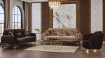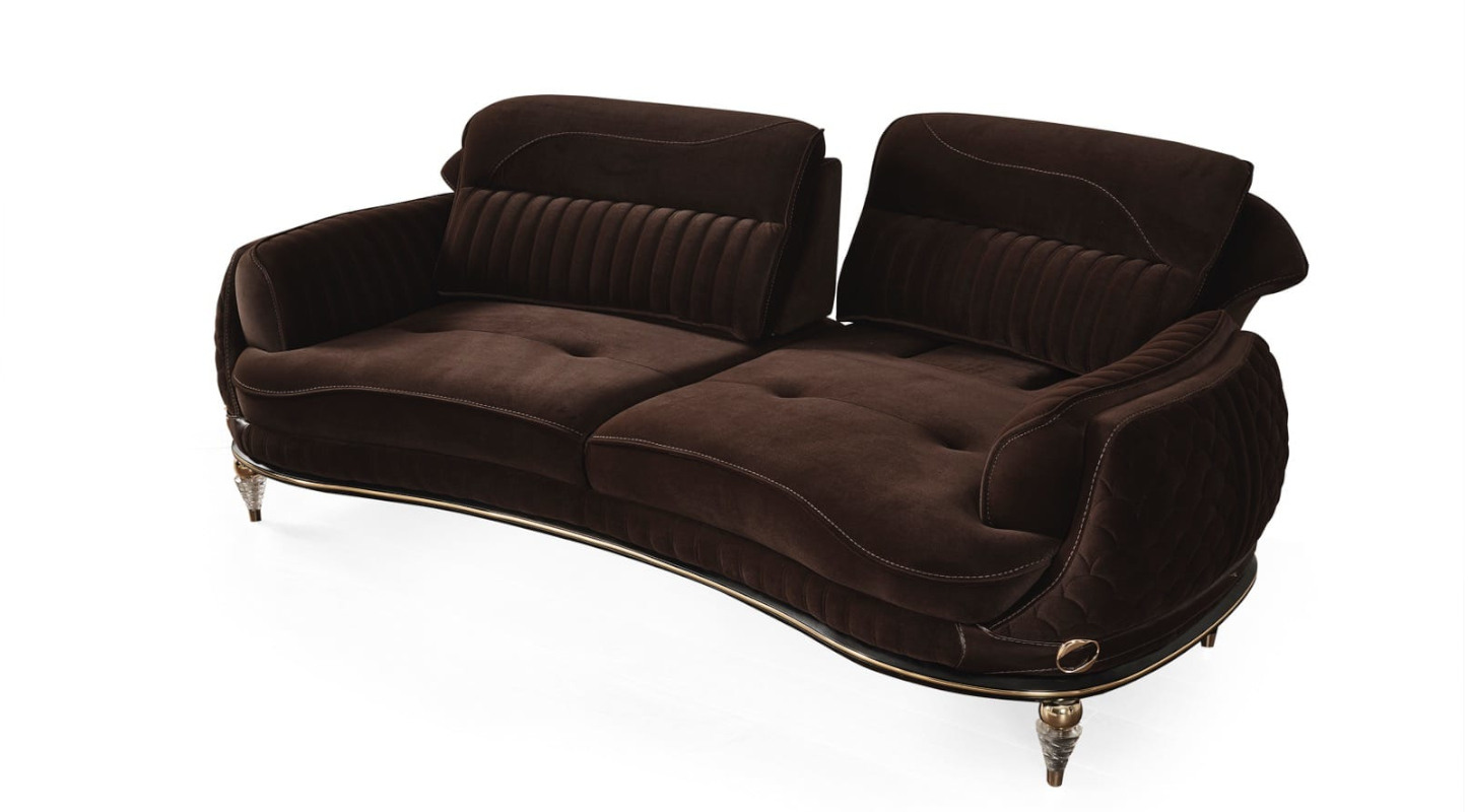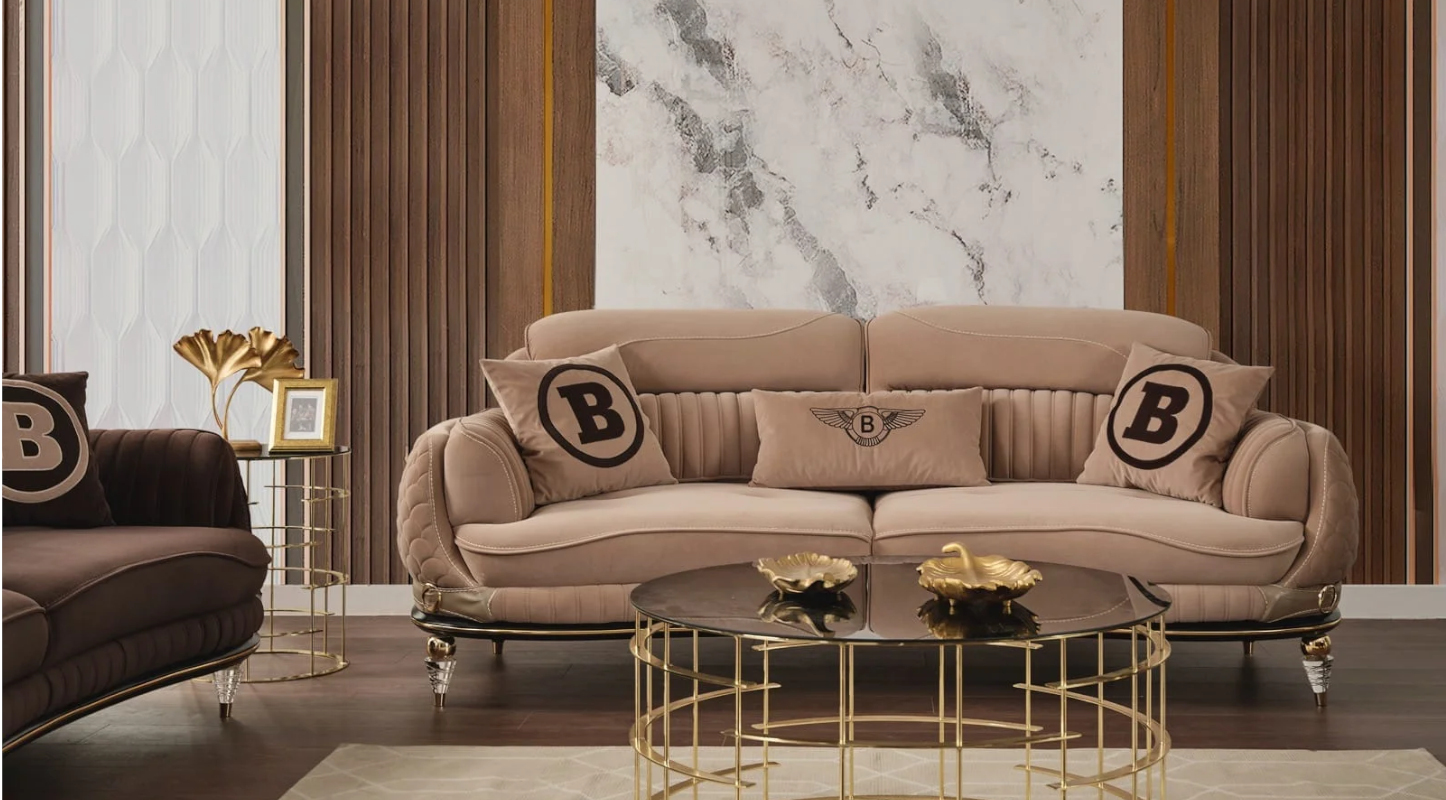 The Atlantis Bentley Sofa Set, a luxurious 3+3+1+1 configuration, features two elegantly curved sofas. One is upholstered in a deep brown fabric with classic button-tufting and sophisticated gold trim detailing along the sides and base. The second sofa offers a lighter, warm beige upholstery with plush cushions and matching gold accents. Both sofas are adorned with decorative pillows, some featuring a prominent “B” logo. Two coordinating armchairs complete this opulent set, all elevated by slender, stylish gold legs, creating a statement of refined comfort.