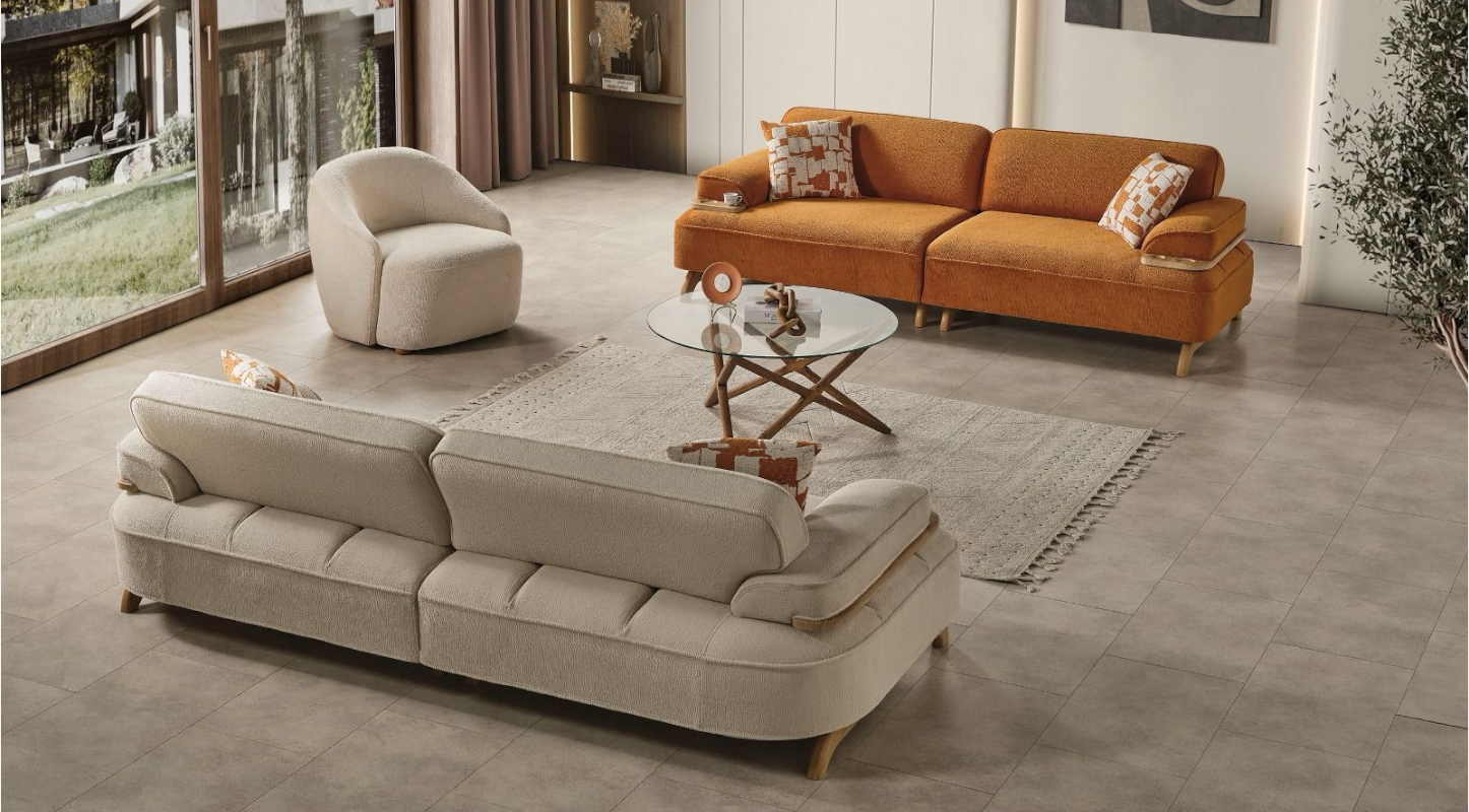 The Avanos Sofa Set features a modern design with two three-seater sofas. One sofa is upholstered in a tan, microfiber