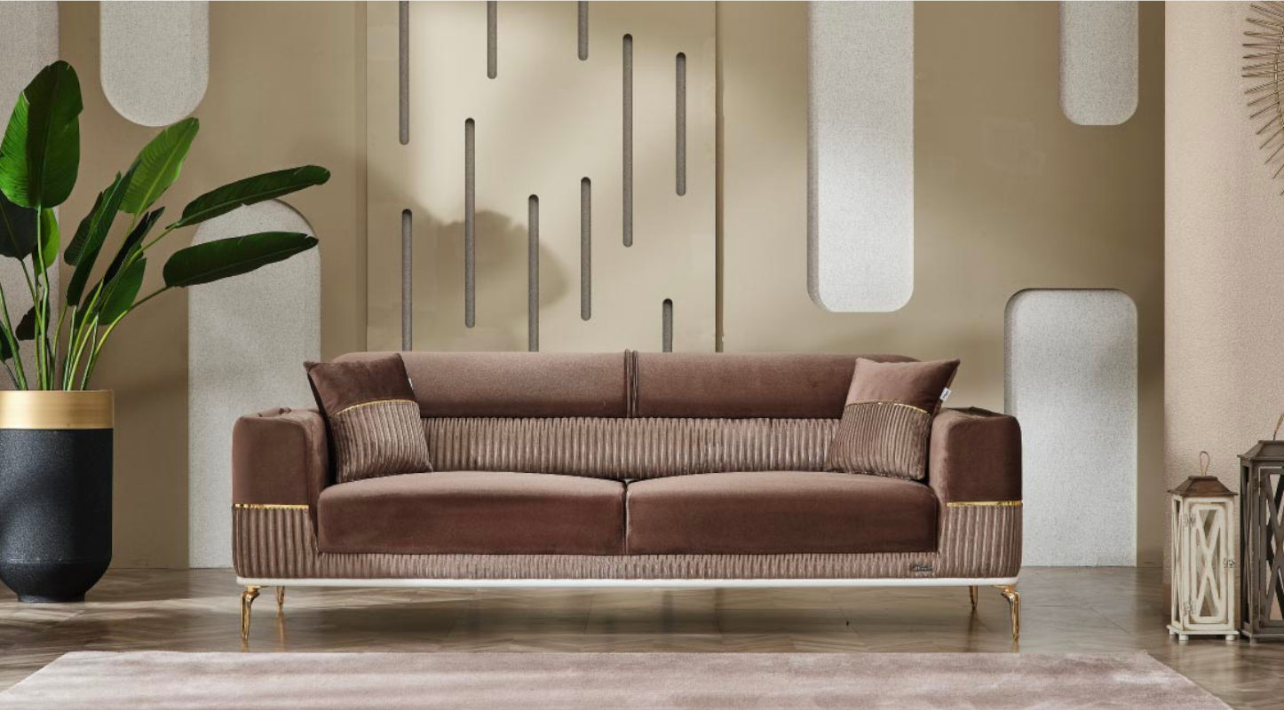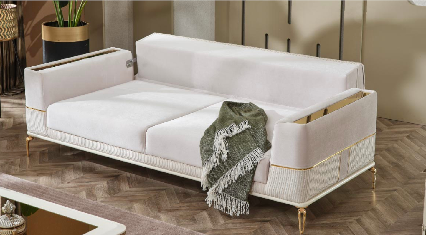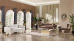 The Alya sofa set showcases a blend of modern and luxurious elements. The light upholstery of the sofas contrasts elegantly