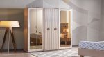 The central section of the wardrobe is characterized by vertically paneled doors in a light, neutral tone, off-white or cream, accented with ornate, circular handles in a contrasting metallic finish. These panels offer a textured and refined look. Flanking the central section are large mirrored doors, which serve to reflect light and visually expand the room. The mirrors are framed by a warm wood-toned border, matching the outer frame of the entire wardrobe. The design balances practicality with elegance, offering significant storage behind a visually appealing exterior. The Akik wardrobe’s clean lines and combination of textures make it a versatile and stylish storage solution.